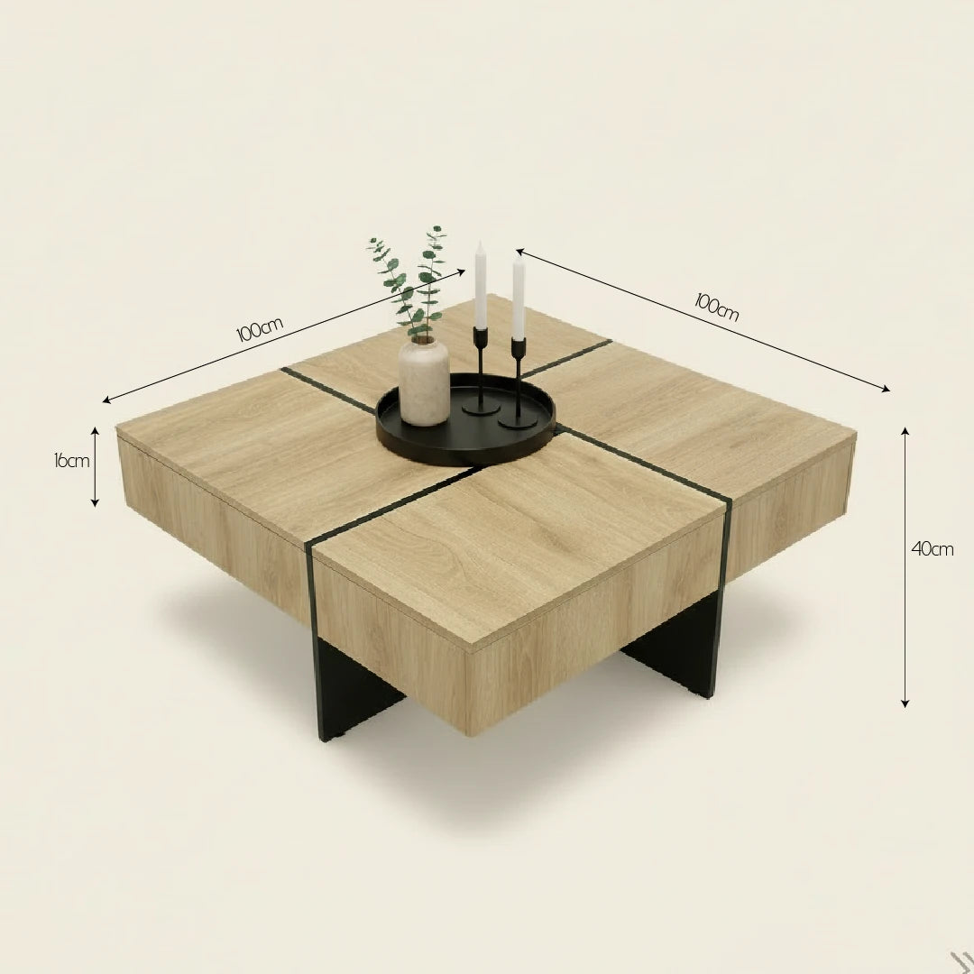 استمتع بلمسة من الفخامة العصرية مع طاولة القهوة المميزة هذه، المصنوعة بدقة من خشب MDF عالي الجودة لضمان المتانة والمظهر الراقي. يتميز سطحها بتشطيب خشبي دافئ يقاوم الخدوش، مع قلب هندسي أسود يضيف طابعاً فنياً فريداً لغرفتك. تجمع بين التصميم الجمالي والعملية بفضل أدراجها المخفية الذكية، لتكون القطعة المركزية المثالية في منزلك.